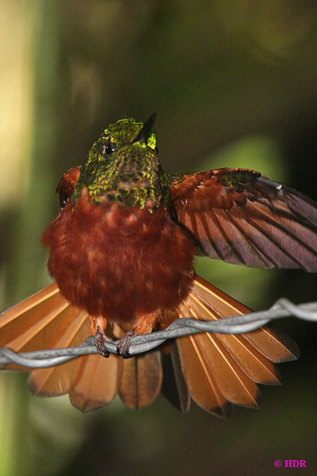 The tail flair from Guango in a difficult "almost" shot. Virtually all the undersurface of this hummer is rufous. And that breast is just a luscious rufous tone. |