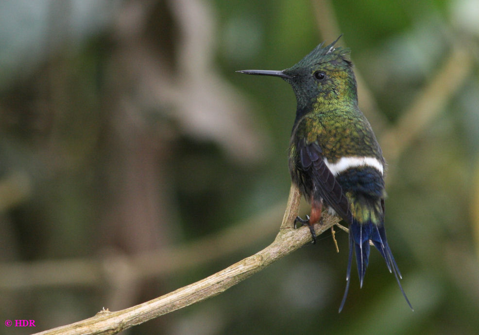 | A younger male from above. Shows the forking of the tail in this species as well and the marked bronzing on the back of the head. Throat and belly almost female colored but missing the facial line. |