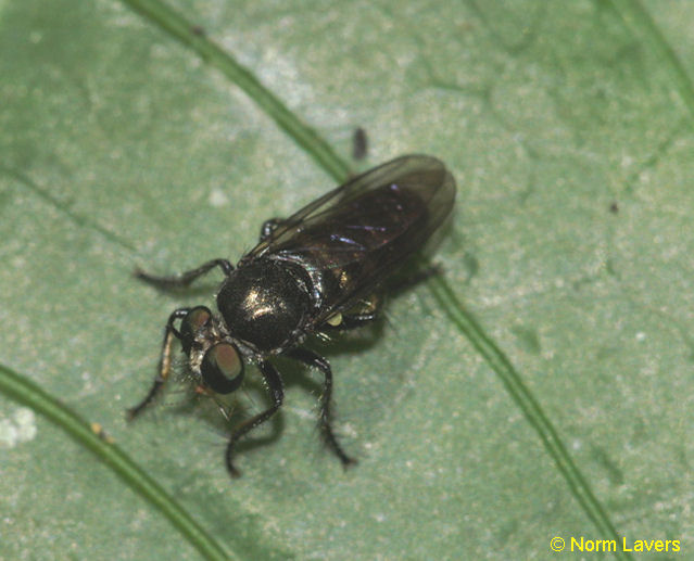 Shot 18. Possibly an Atomosia relation. Very metallic reflections. And the wrong perching position for Atomosia proper. About the right size. Dr. Fisher believes this is an Atoniomyia. |