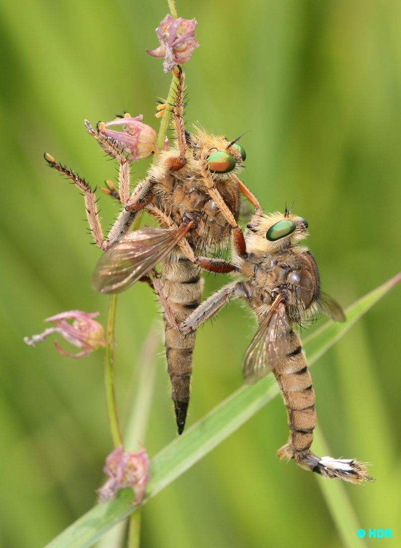 Specimen shot of this prettiest Promachus species in my state. This is a vanishing species in the east and northeast apparently. And it is not common here. I believe I saw four in all of last summer. Compare that to hundreds of P. hinei and P. bastardii. P. fitchii only showed itself in stubble fields including recently plowed fields and grassy regrowth. Note the white tail-light on this male which is similar to the P. bastardii tail. The eyes on this species are a distinctive red-green. The robber appears creamy golden overall in sunlight. The western species truquii apparently resembles fitchii only has gray to whitish hairs overall with a yellowish beard. |