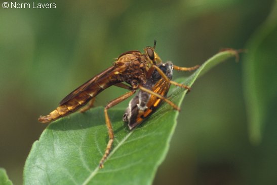 A fine Georgia Asilus female showing the body color and elongate abdomen. Appears to have a lacewing snack pierced. |
