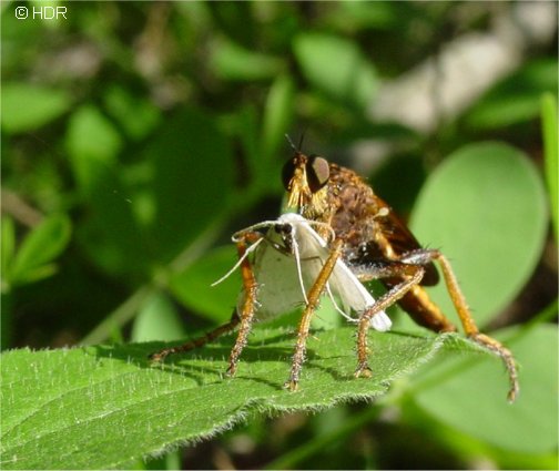 Asilus sericeus. One of the first robbers out in spring. Certainly the first robber fly that I ever collected. Net in hand, I marched over the road in Baxter County with my wife back at our cabin shaking her head. Up popped these long red-orange beasts. I took one and then proceeded to photograph many in this open field of flowers (now gone). They were voracious moth eaters. In fact, they went for just about any insect I flushed that day. Skittish when holding a meal, like many robbers, this one seemed proud to show off this moth with the goggling black eyes. I have since had them in my yard on Round Mountain. With its red-black wings and elongate form, this is a distinctive robber fly in Arkansas. |
