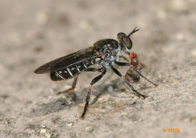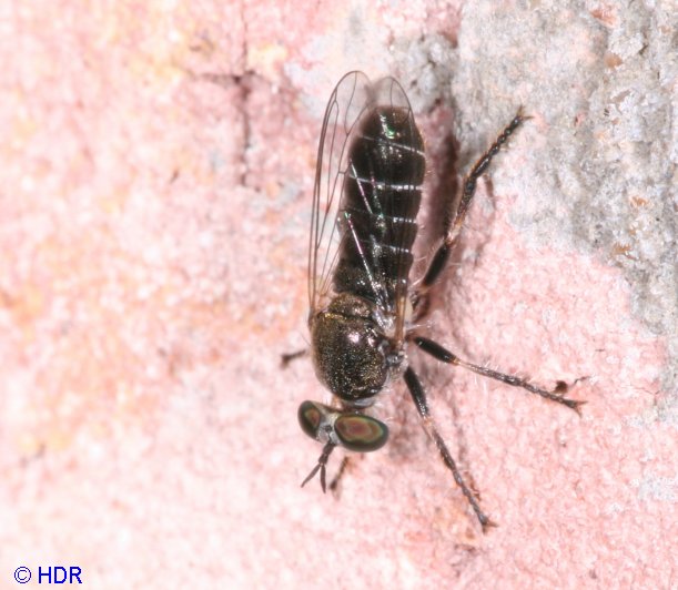 Atomosia are the diminutive representatives of most eastern robber faunas. There are now just eight species in the genus north of Mexico and most are eastern. Only one is purely western (mucida). This is Atomosia puella. And it is one of the tiniest robbers in our state. Appears even smaller than Megaphorus in flight. Like a tiny fly that likes to land on downed wood and flat surfaces. Without careful observation it can be passed off as a non-robber fly. Norm Lavers gets these all over the gardens in his yard. (Cheryl, of course, found the first ones.) Very active when I saw them and they do cluster and have little flight battles over their perching sites. We have several species of Atomosia documented for the state. And likely several more to go. A surprise species turned up in collections with Jeff Barnes reviewing this genus. It has now been defined as a new species, A. arkansensis Barnes 2008. A. puella is likely the darkest species and may be the only one here with all dark legs. |