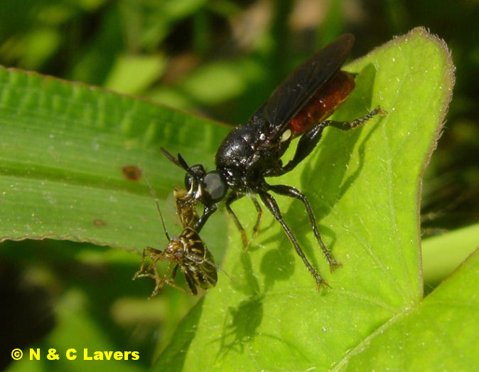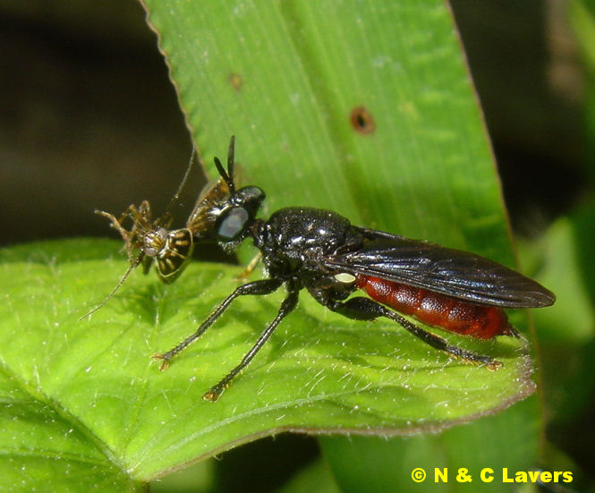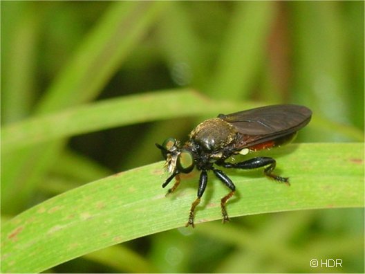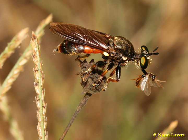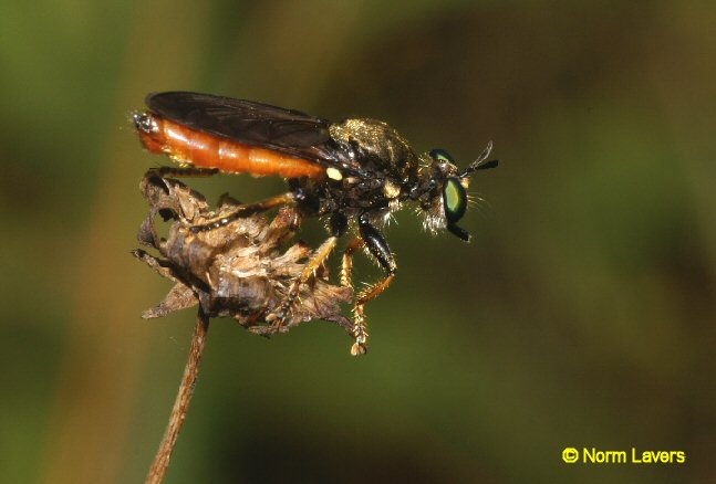 This genus is also small. Two recognized species in the US. This is Lampria rubriventris. These are small to medium creatures at ten to fifteen mm. Green eyed, they also have the flattened proboscis sheath like Laphria and are apparently closely related to the big Laphria genus. We have both species of Lampria here in Arkansas. This species ranges over to WY and CO. It is not well seen in this shot but that orange on the anterior abdomen can be almost electrically bright. I found these in open fields near woods. Never heavily concentrated. Skittish and visually alert at all times, they often perch at a thirty to forty degree down angle, which is unusual for robbers. |