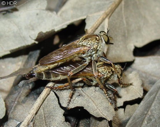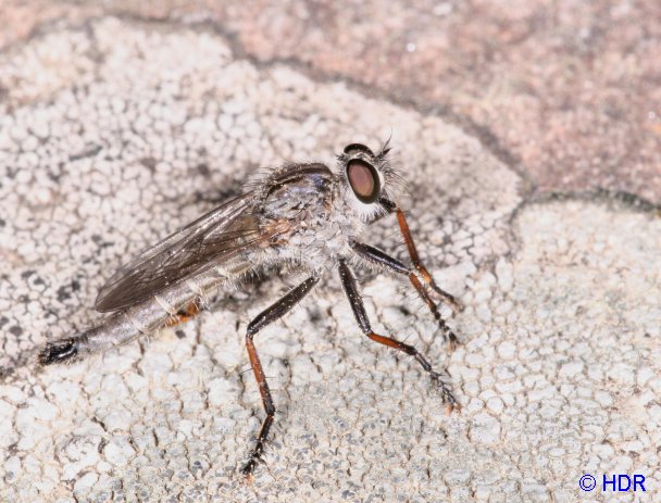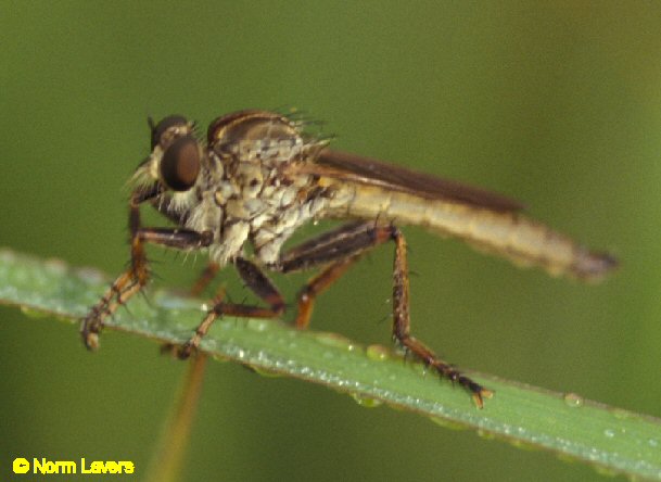Machimus erythrocnemius taken in Boone county. This was in the prairie area where Norm could not collect robbers. Fortunately this shot shows the spines on the profemora that define this prairie species. Note the orange and red markings on the legs as well. We have subsequently collected specimens of this insect in five counties in the state otherwise. It is not a strict prairie species and turns out to be more common in our state than prairiensis. |