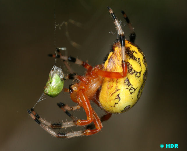 She is lovely, no? This is the distinctive Marbled Orb Weaver, Araneus marmoreus. Common in the east and I don't think anything else has markings resembling this marbled pattern on the back. The web has an escape line to the center of the main orb. Males are half the size of the females. Vertical web builder in deciduous woods in August to October, the female builds a retreat of conical rolled leaves in the upper escape corner. This spider is found from Alaska to Texas, virtually everywhere except the SW. |