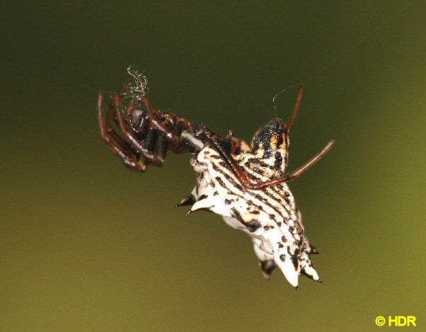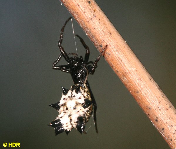 The late summer hiker's nemesis. Micrathena gracilis. Surely the most common weaver in the south in the July, August, September window with her webs stretched across every wooded pathway. Distinctive and spiniferous. I can't tell you how many shots I have tried of these and they just didn't work. This at least shows the major features. |