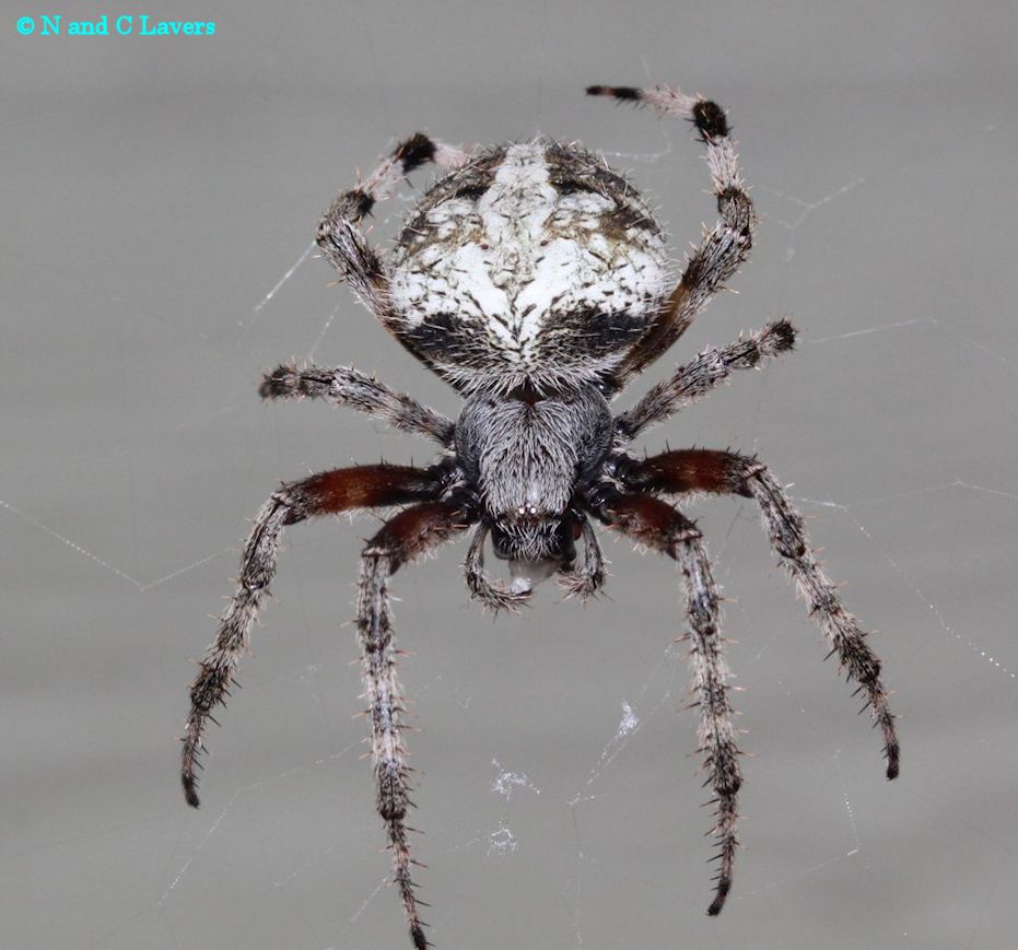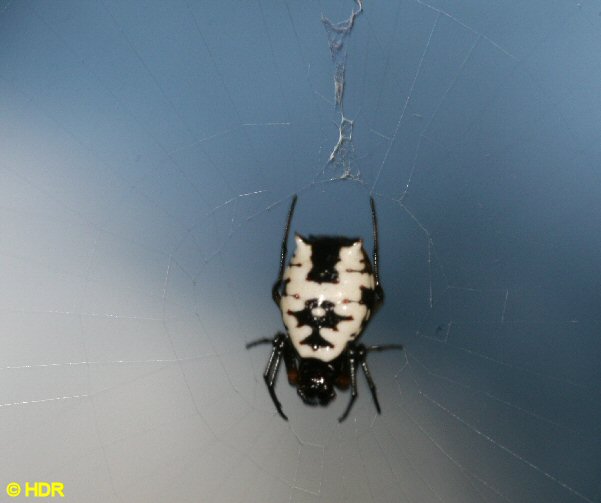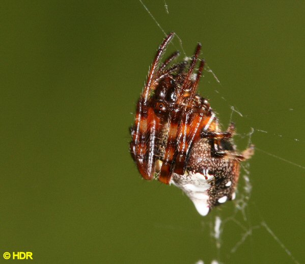 An orb that I could not definitely place to species. It is perhaps another Neoscona species but I am not sure. I believe it is N. domiciliarum, another of the widespread weavers. The shining eyes are interesting. And Judy Semroc noted that in the front of the thorax you can see an almost perfectly formed tiger face. Surely this must be distinctive. |