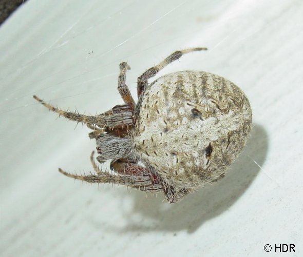A pale Orb as large as the above. Likely another Neoscona. And perhaps the same as the dark red orb above. I believe this one adjusted to the white house. It was living under the eave of my house, it kept trying to make new orbs over my garbage can. |