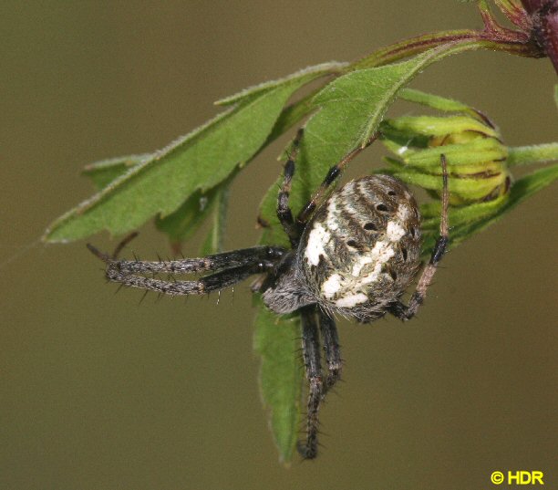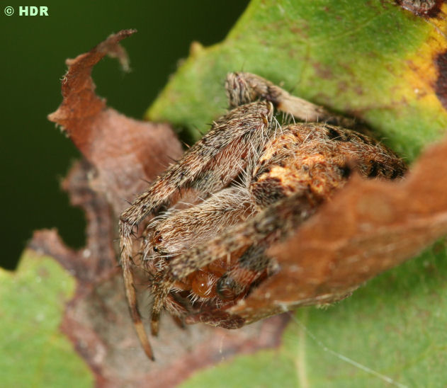 Another big Araneus in her hide. This one was even larger than the above. This is A. bicentarius and is likely the number two spider in size in a web after the biggest Argiope in the state. This species is usually green in color and can vanish in lichen covered woodlands. My daughter spotted this one on our road. Apparently not very common and males are virtually unknown in spider collections. |
