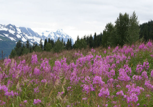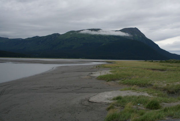From the hillside above the road where you can stop and PAN FOR GOLD (a large lettered banner) the bay and mountains stop all my thoughts. The water out there never seems to be at rest. Tidal motion seems continuous, though the arrangement of bays and waterways is confusing. The moon just pulls at everything and the water tries to get out or in or around whatever is out there. Get out of the way. Something is always in the way. Occasionally we pass great sudden wave washes from I don’t know where. It is not a swimmer’s landscape. The goldpanning tourist spot we stop at was raided early in the morning by Black Bear. Not clear whether this is singular or plural. We just missed him or her or them. The dog chased the bears off. Apparently many dogs up here are just for that: bear guards. The tenants remembered to bring in their garbage but forgot to take their popcorn machine in for the night. One is supposed to enjoy popcorn while panning I presume. But anyway, this is not something one should ever forget in Alaska, your popcorn machine or your garbage in the night. Down the slope from the gift shop and the panning area, an outhouse sits. I can’t imagine it stays out of the snow for long in the winter. I am not sure of the logistics of toiletry in the far north. I picture someone bolstering themselves in the 40 below night and shrieking wind to reach the outhouse in January. Perhaps one digs it out all winter, keeping the access open. I don’t know. Perhaps one abandons all urination in the deep cold. There is an old mine shaft just past the outhouse. And some semblance of an aging vegetable garden. Around the other outbuildings Fireweed grows in great stalks anywhere the sun shines. It is the roadside purple of southern Alaska.