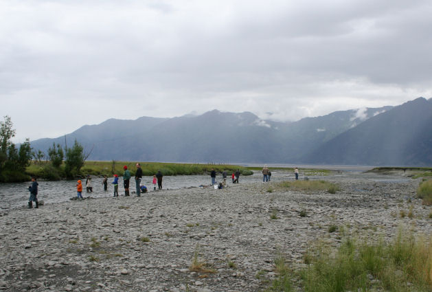 The road south from Anchorage is winding and frankly breathtaking. A freshwater marsh stretches east in the first five miles. It appears to have been created by the roadway itself sometime in the past. The ducks gather there. Mallards mostly. And I forget that in Alaska the males have lost their green heads. They all look maternal, though the males are still darker. The youngsters are wary behind the adults. I find one male with the shadows of greenishnish coming back on. We walk the boardwalk from the marsh parking lot. In the brush are Redpolls, a northern finch and scores of Yellow-rumped Warblers. Yellowlegs wade the shallows and talk. And, over by the roadway, where the stream runs out of the trapped marsh under the road itself, salmon have gathered. Masses of Silver females and males and mixed with them are the great red Chinooks. Fantastic things, jockeying for position in the clear water. It is salmon running time in many places that we venture during the week.