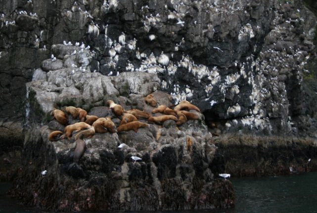 Outside the harbor it was all Fjords and inlets, walls of towering stone decorated with birds and bird droppings. You think interior Alaska is lovely and then you see this. It is a bird lover’s eye full. We would pull up to the walls of stone and there would be thousands of Black-legged Kittiwakes and their chicks precipitously perched on the faces of stone. Common Murres, which look for all the world like miniature Penguins (there are no true penguins in the north seas), preferred the slightly sheltered caves and rock overhangs. They clustered together, bellies pressed against the rock looking barely balanced. They swam and dove everywhere. The swimming and diving things were absolutely everywhere. Puffins abounded. Both north Pacific species were here, looking dapper. Laurel remembered them with the sentence “tough guys wear black”, the Tufted Puffins having all black bellies. The more common Horned Puffins having white bellies which were very distinctive in flight. When the boat slowed the puffins became slightly more trusting. The Tufties with their swept back head decorations, the Horned with their white faces and comical eyes, engaging things, who wouldn’t want them in their waters?