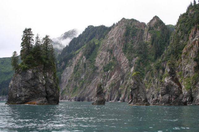 Down a ramp and up a ramp and the 40 foot boat awaited. Mist coated the waters which were mostly calm. Windless days are not that frequent here. The motion sickness patches went on behind the ears of my family members anyway. They looked prepared. I like to ride on the bow of the boat for my occasional oceanic excursions. So I quickly shimmied up front. But in Alaska, I can tell you, even at low speed in summer, you don’t ride on the bow. You will lose extremities. I retreated. My family looked out from the great windows in the cabin, sheltered. My family was a third of the boat load here. And, barely out of the harbor lanes, we encountered one of the world’s great animals. Instantly recognizable by even the least naturalistic human out there, the sea otter is like the Panda of the ocean. It floated in the classic pose on its back with its belly and its feet in the air. Alaska is one of the strongholds for this recovered animal. I have looked for them in Oregon to no avail. Its fur is the richest and densest in the world. Russians went mad for it back in the 1700s and 1800s. They killed all their own Russian otters. In the Aleutians, they made the locals hunt them down for them. Took hostages. Shot people. Prices in China were exorbitant. Small pieces of otter fur were like gold. After James Cook was slaughtered in Hawaii, his crew wandered up this way and discovered the market for otter. They nearly mutinied demanding to go back and just hunt otter pelts. Many believe that when the otters were nearly exterminated, the Russians considered this one of the reasons to sell the place off. “Give it to the Americanskis, we killed all the otter anyway” being the whispered secret I guess. We saw many otter for the day. We always stopped. Often they would let us float close and stare. They are doing well there. Fortunately for all. Though, they are not absolutely safe. It is estimated that the Exxon Valdez spill killed 5000 of them. Good God.