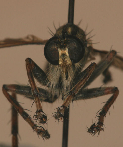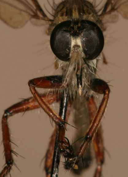 This is Machimus erythocnemius. More golden faced like prairiensis. No white hairs on femur. Legs look more coated with the hairs on this species. Femur rings of orange. |