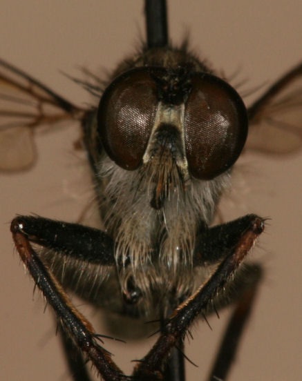 Machimus snowii above left with fine white hair on the femur and the orange dominant tibias. On the right is notatus which is the darkest overall with almost all black legs. Note the darker mystax and face as well. |