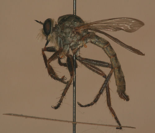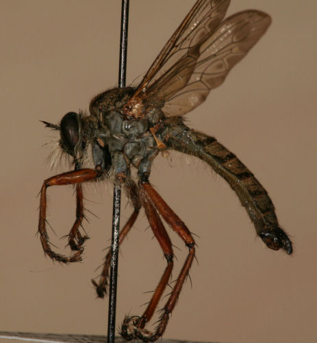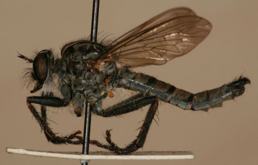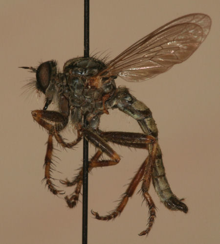 The difficult Machimus genus can be tough anywhere in the south. On this page are five of the species in our area. Above left is M. antimachus. And right is M. prairiensis. M. antimachus may have the most wing darkening of any of the species. And it is the main species in the east with the femora mostly orange. M. prairiensis is usually very clear winged. M. prairiensis has the orange limited to the distal femur and proximal tibia. |