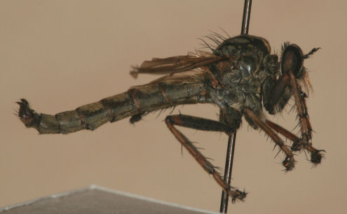 Machimus snowii in the above left is the species that sticks closest to wet lands and even swamps. Most of the other species are dry land and upland or prairie species. Note the contrast between orange tibias and darker femurs. On the right is notatus which is the darkest overall with almost all black legs. M. notatus is a spring species and often one of the first robbers out in some areas after the Laphria. We seem to have M. virginicus which is also darkish and separated from notatus by genitals mostly. M. sadyates is also dark legged with a much darker upper mystax (not pictured here). |